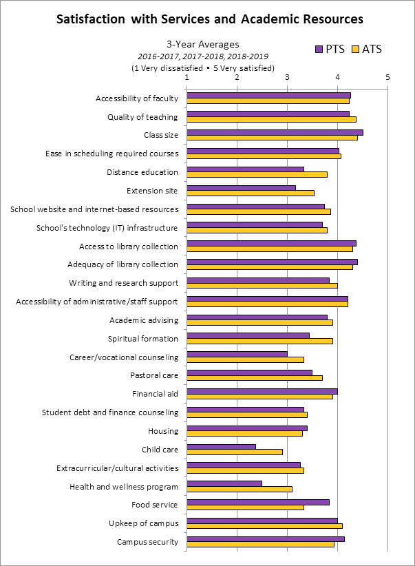This chart provides information which indicates student perceptions about their overall experience as a student at PTS. These data are a mixture of both academic and non-academic areas and were chosen based on the relationship to outcomes and educational effectiveness. The chart presents average results for the last three years of the survey for both PTS and all ATS institutions.